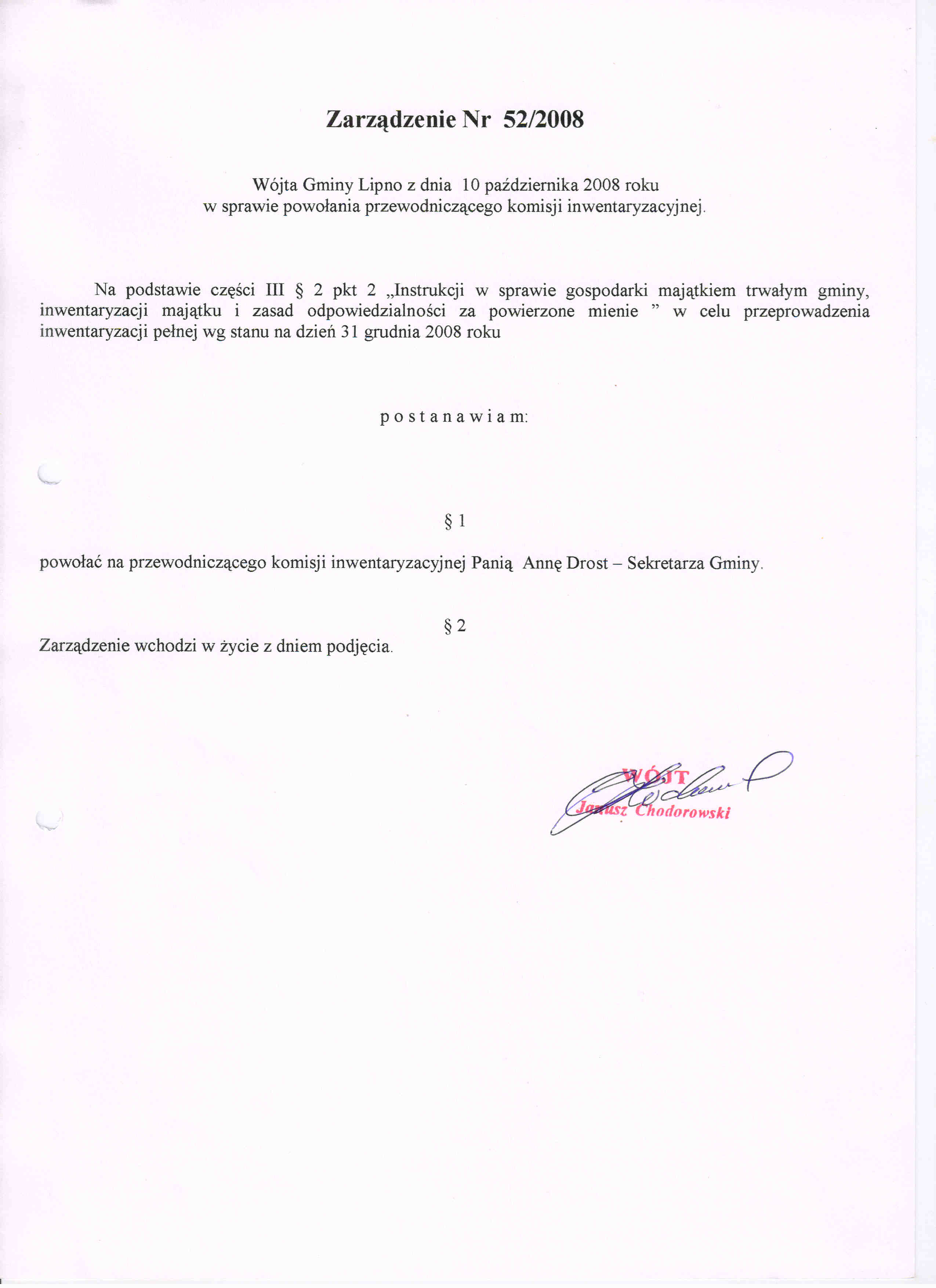 Treść zakładkizarządzenie Nr 52/2008 w sprawie powołania przewodniczącego komisji inwentaryzacyjnej