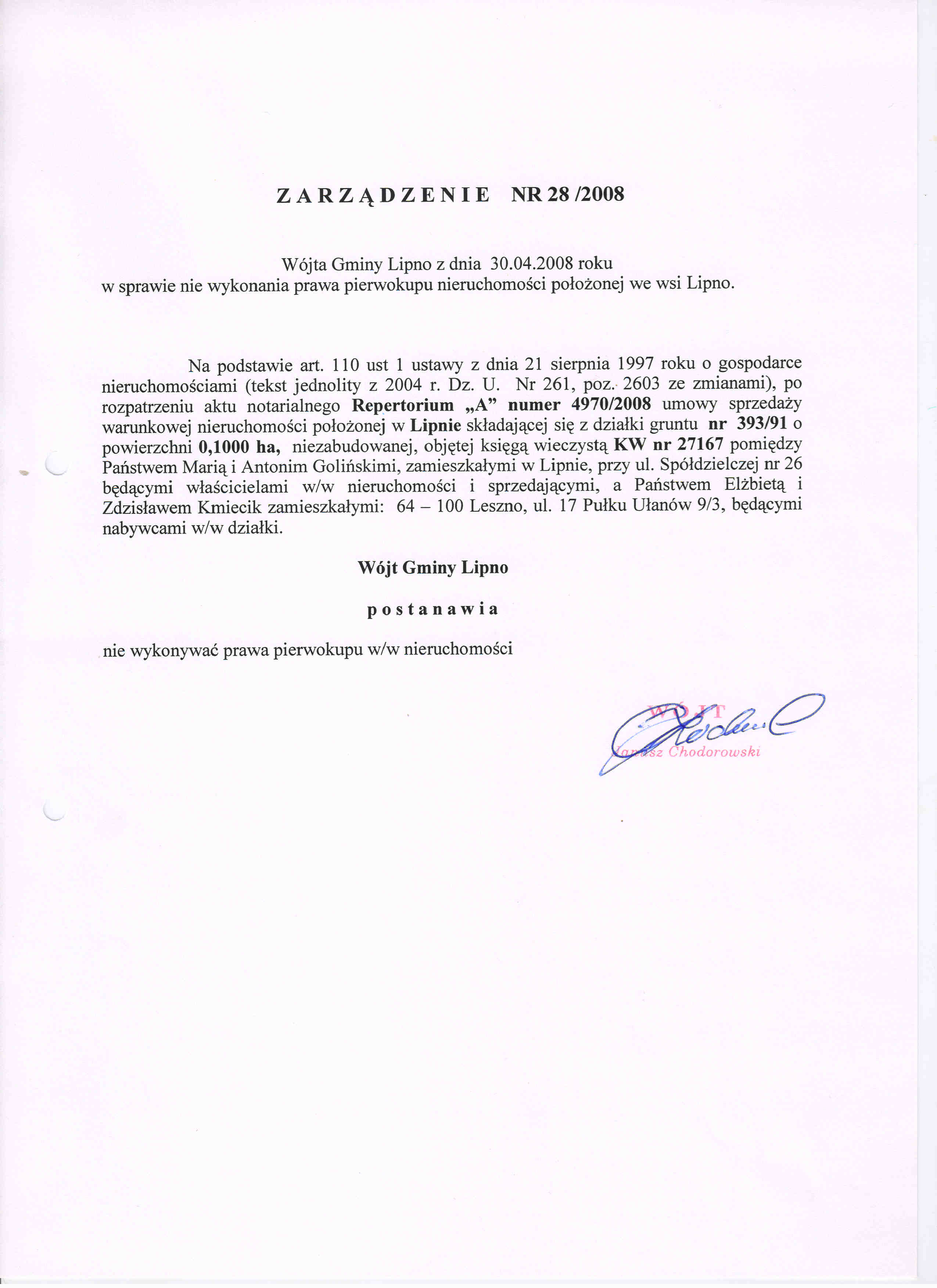 Treść zakładkiZarządzenie Nr 28/2008 w sprawie nie wykonania prawa pierwokupu nieruchomości położonej we wsi Lipno
