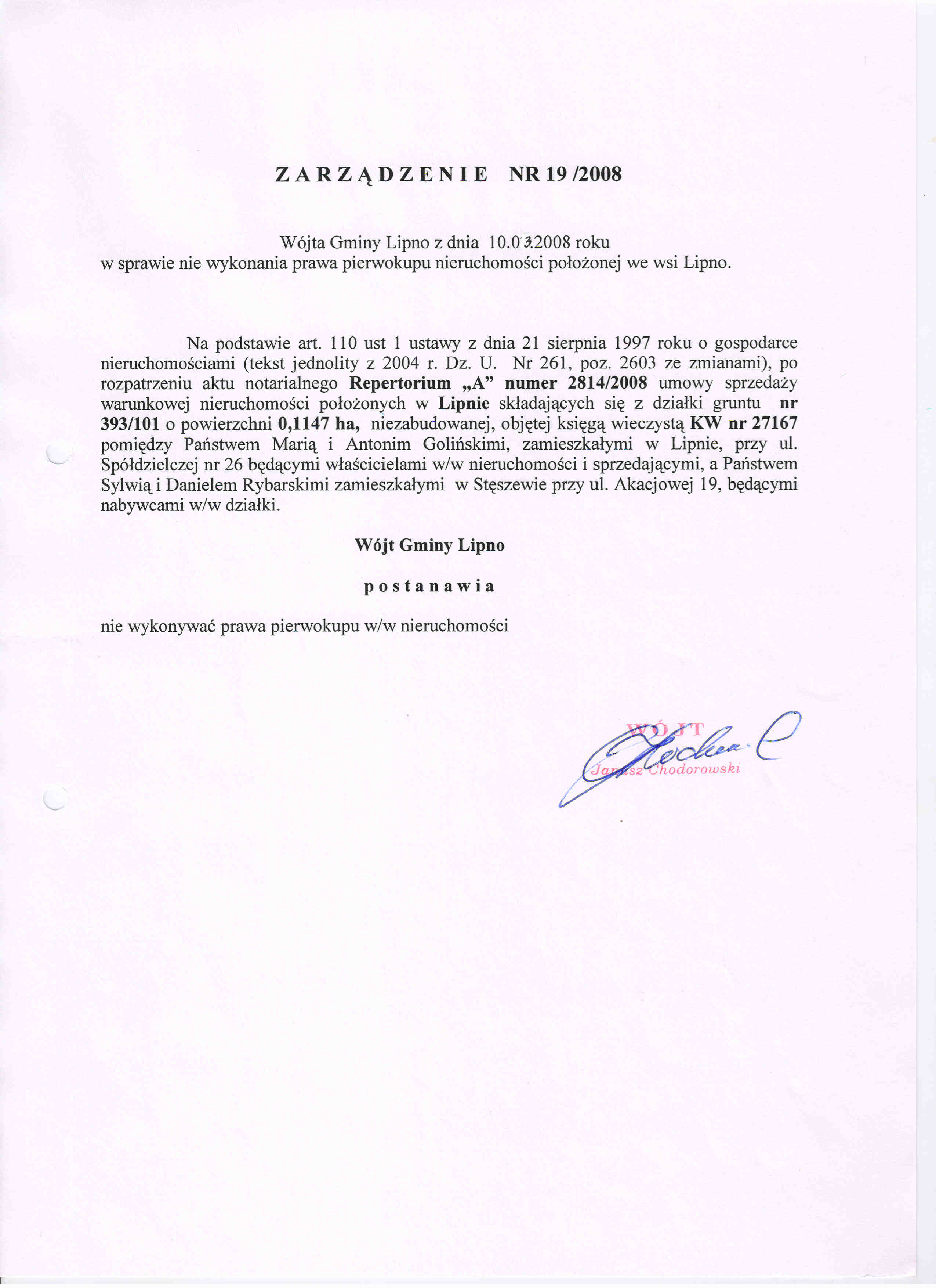 Treść zakładkiZarządzenie Nr 19/2008 w sprawie nie wykoniania prawa pierwokupu nieruchomości położonej we wsi Lipno