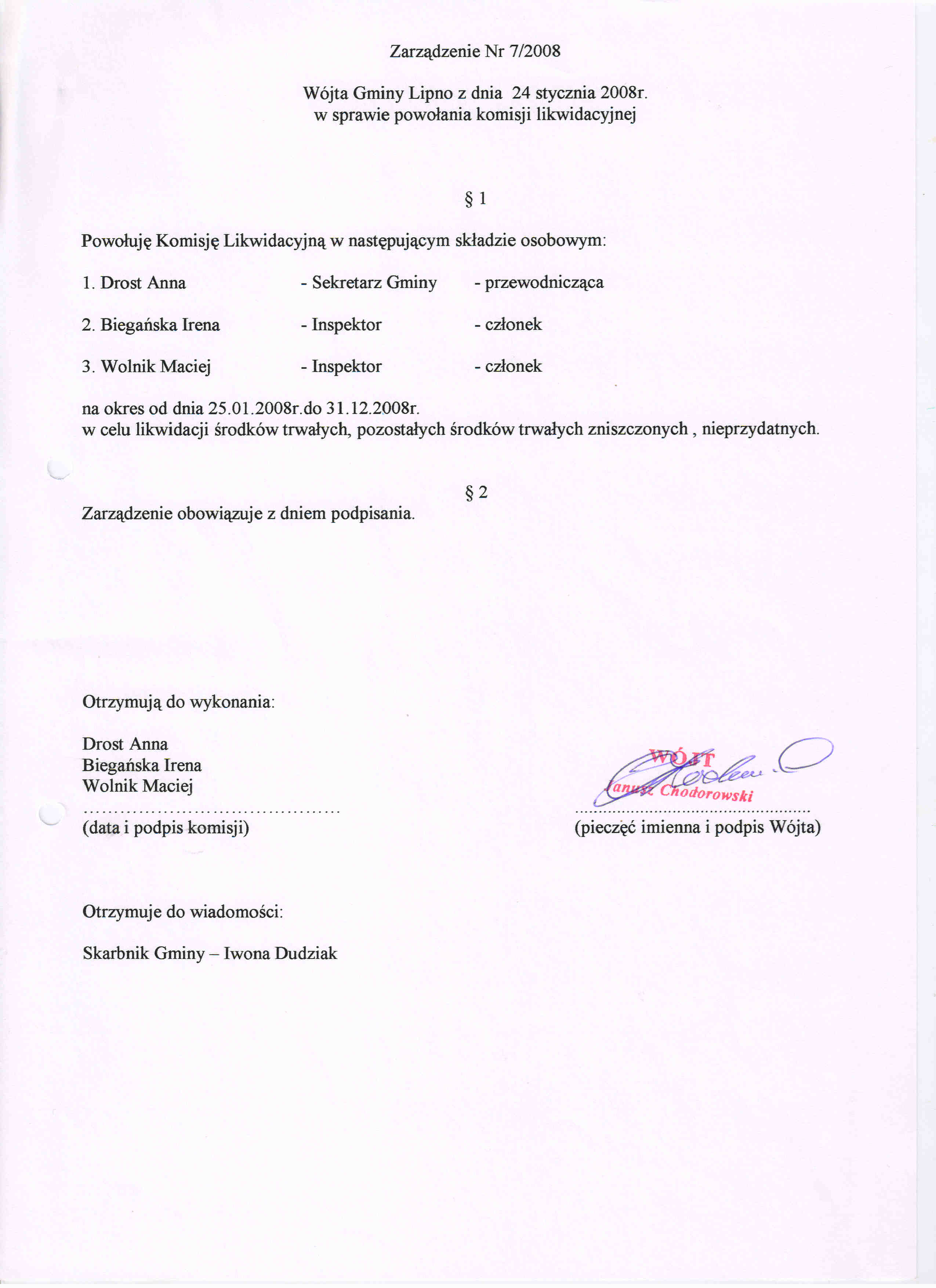 Treść zakładkiZarządzenie Nr 7/2008 w sprawie powołania komisji likwidacyjnej