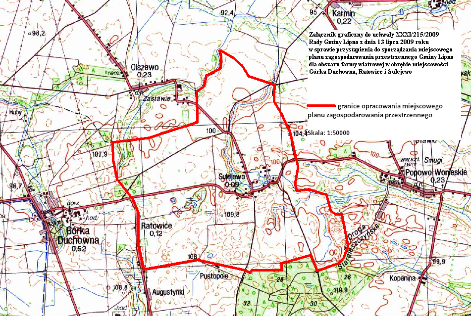 Przystępuje się do sporządzenia miejscowego planu zagospodarowania przestrzennego Gminy Lipno dla obszaru farmy wiatrowej w obrębie miejscowości Górka Duchowna, Ratowice i Sulejewo, zwanego dalej planem.