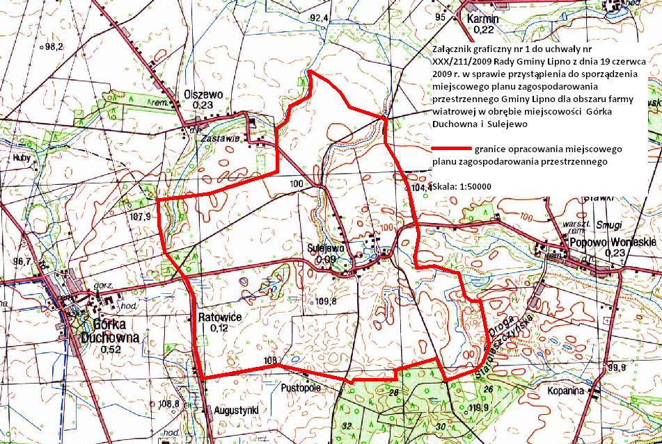 Przystępuje się do sporządzenia miejscowego planu zagospodarowania przestrzennego Gminy Lipno dla obszaru farmy wiatrowej w obrębie miejscowości Górka Duchowna i Sulejewo, zwanego dalej planem.