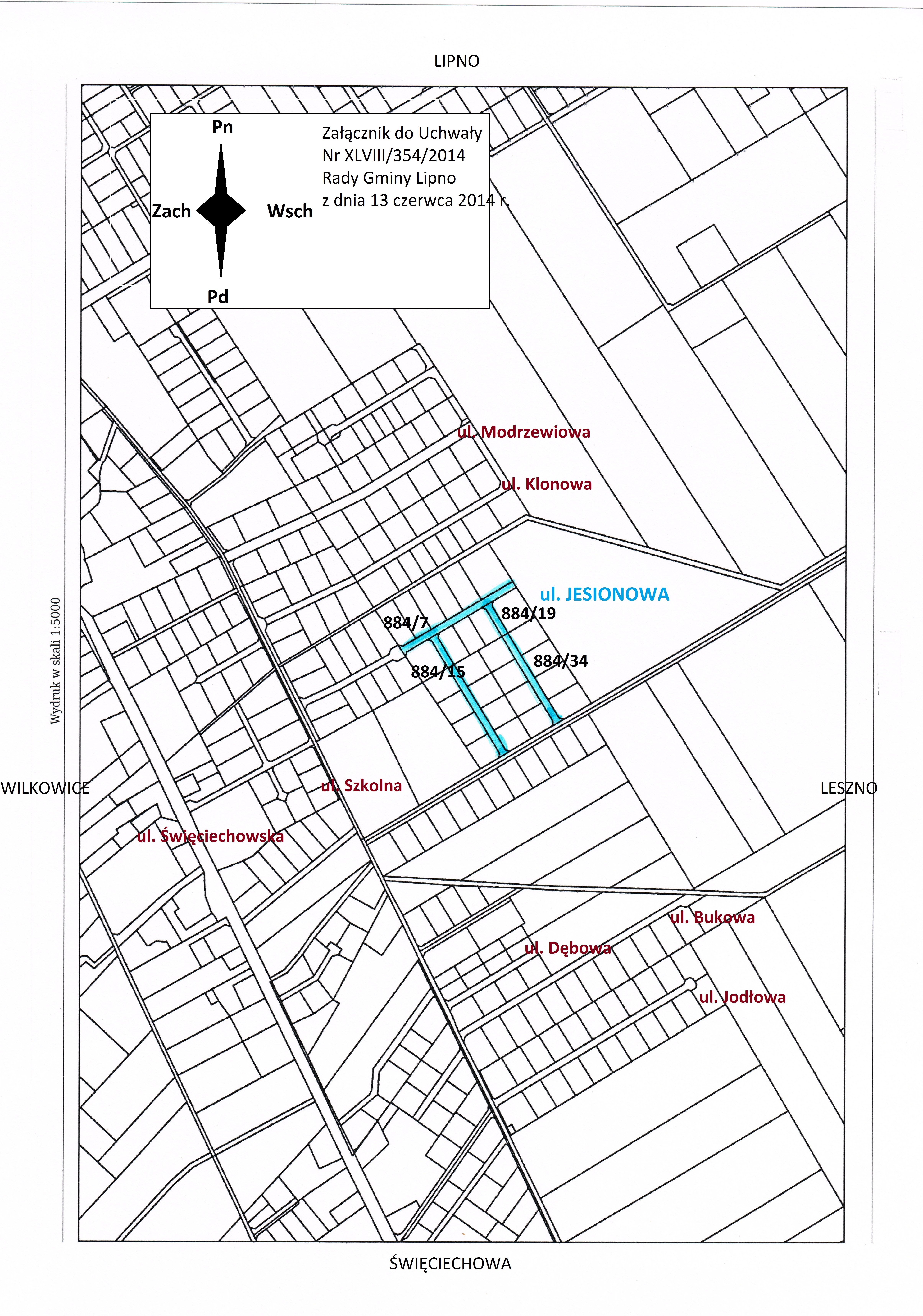- Drodze wewnętrznej, zlokalizowanej w miejscowości Wilkowice, na działkach oznaczonych geodezyjnie 884/7, 884/15 stanowiących własność Gminy Lipno oraz na działkach oznaczonych geodezyjnie 884/19 i 884/34 stanowiących własność osób fizycznych, nadaje się nazwę: ulica „Jesionowa”.